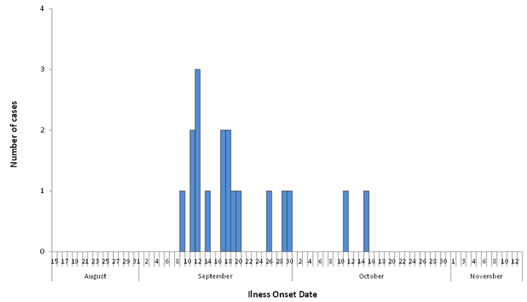 Figure 1. People confirmed to be infected with the strain of E. coli O157:H7 detected in the XL food safety investigation, by date of illness onset